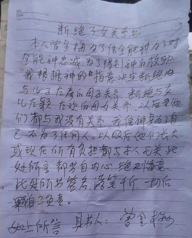 这个时候我们才注意到了不对劲,信神怎么会信成这样啊,首先你去挨家挨户的敲门就是对别人的骚扰,对别人的不尊重。我们的亲戚朋友都来劝说妻子,让她不要迷信,谁知妻子竟然大喊大叫说我们是魔鬼是撒旦,第二天就一去不复返离家出走了,我们多方打听也没有任何音讯,孩子每天哭喊着找妈妈,岳父为此生气生病住进了医院,我是医院家里两头跑,快到春节时,老人出院了,妻子也回来了,谁知道竟然说自己的父亲生病是因为阻止她信神,被神惩罚的,哎,无知的人啊,老人被气的哇哇直哭,这个年就在这样的气氛中过去了,13年的到来以为信神的妻子会有所收敛因为末日没有来到,太阳也是照常升起,谁知道她不但没有醒悟,而且更加的痴迷,孩子不管家务不做,整天的出去聚会,就连孩子生病也不闻不问,早早的出去很晚才到家,回到家饭也不做,还挑饭不合她的口味,我的忍都是为了孩子,换来的全是她无情的伤害,书籍还有mp5,整天的看反复的看,最可恶的是她竟然把家里的一万块钱的现金偷偷拿走去奉献给她们所谓的神。我真的失望了,劝说没用了,她说她们的神就是来打破家庭的,就是让人接受痛苦熬炼的,她学会了说谎,亲戚朋友她都骗了,借了好几万的钱说是做生意,都被她偷偷的拿去奉献了,她整天的说今年会有灾难,只有尽所有的最大的本分才会被她们的神拯救,又是一年过去了,13年过去了,也没有她们所说的灾难,现在她们的神又说14有大灾难,哎无知的人啊,一年一年的过去了,一年一年的信这个邪教,现在邪教全能神又指使她离婚,说是信神的熬炼,孩子的哭泣不能唤醒一个母亲的母性,全能神让一个善良慈爱的母亲一个温柔贤惠的妻子变成了一个麻木不仁无情无义的魔鬼,一个孝顺的女儿变成了一个丧心病狂的畜生,真的失望了,请求有关部门赶紧的管管吧,不要让我那无知的妻子去传教害人了,不要让邪教全能神继续害人了,邪教全能神是反家庭反人类的邪教,希望大家都来抵制邪教全能神,写的不好,真实的经历。